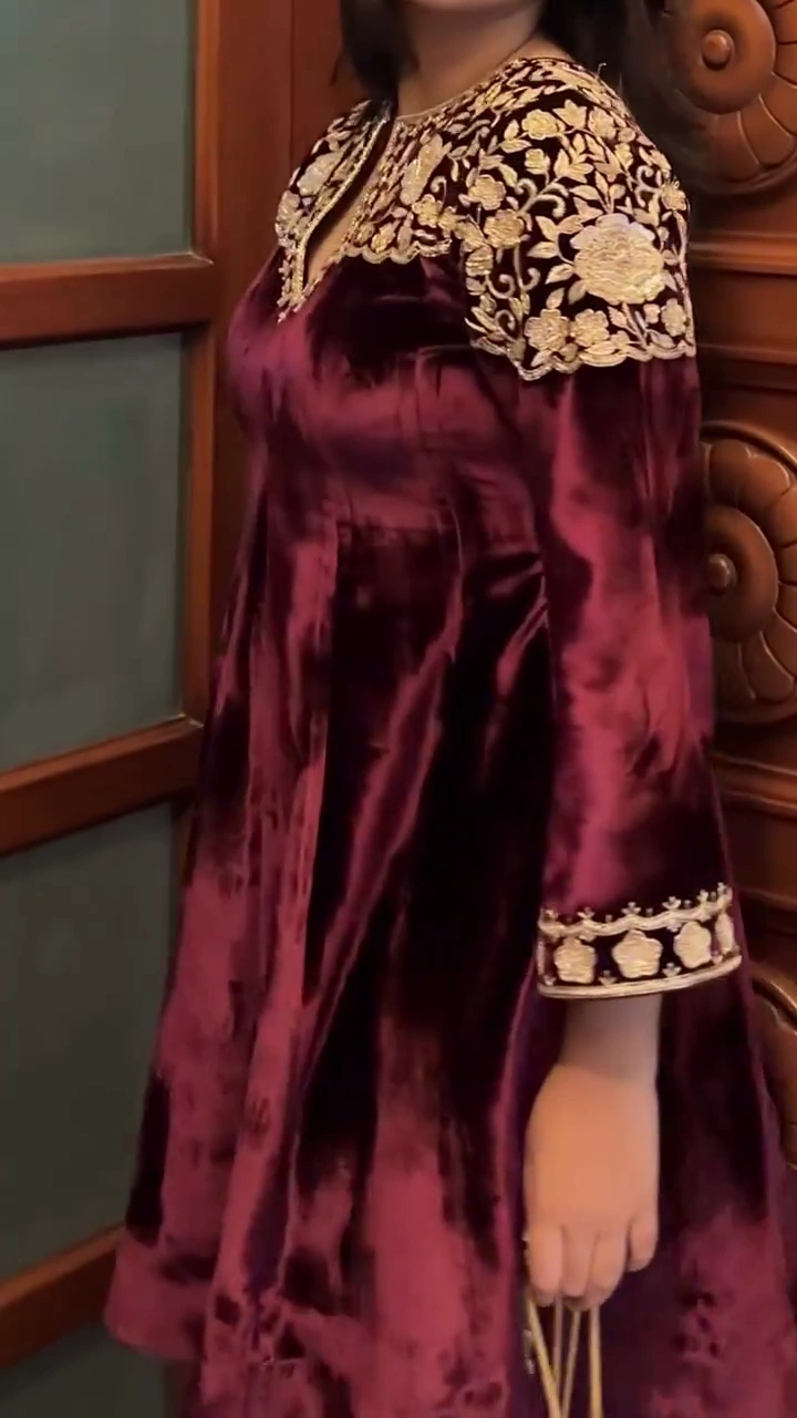 Designed with three-quarter sleeves, this kurta provides a classic traditional silhouette while ensuring comfort and ease of movement. The neckline is tastefully shaped with embroidery detailing, adding elegance without being overly bold. The flared kurta cut gives a flattering fit and allows the velvet fabric to fall gracefully.